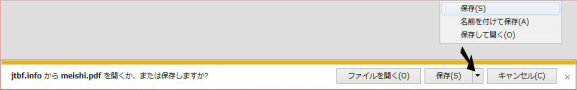 ここで「保存」を選択します。「保存」の右にある小さな下向き三角をクリックすると「名前をつけて保存」も選択できます。「保存」の場合は meishi.pdf というファイル名で「ドキュメント」の中の「ダウンロード」というフォールダに保存されます。「名前をつけて保存」の場合は、ファイル名を変える事も出来、保存場所も自由に決めることが出来ます。どちらでも構いません。保存が終わると「開くか、または保存しますか?」というメッセージが「ダウンロードが完了しました」に変わります。