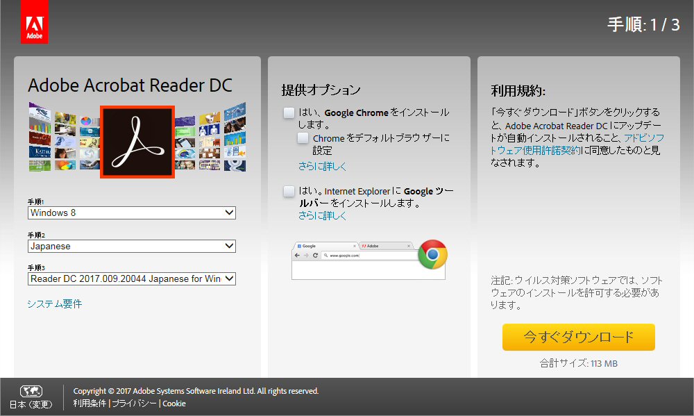 なおこの手のサイトは変化するのが激しく、早晩以下の説明が当てはまらなくなることも考えられます。その時は「Adobe Reader インストール」で検索して適宜新しいインストールサイトを探してください。