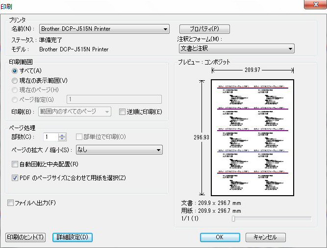 この印刷設定画面は Adobe Reader のバージョンによって異なります。まず最新のバージョンです。