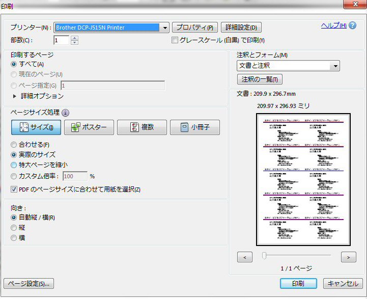 名刺印刷ドキュメント(PDFファイル)が表示された状態で「ファイル」⇒「印刷」をクリックすると印刷設定画面があらわれます。